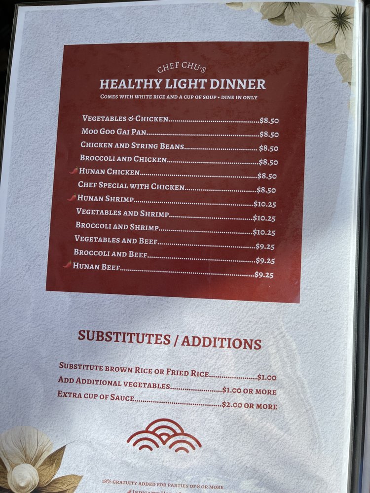 Welcome to Chef Chu's, where culinary tradition meets modern dining in the heart of Waupaca, WI. This charming Chinese restaurant boasts a menu filled with beloved classics, ensuring that every palate is satisfied. Customers rave about the Mongolian Beef, renowned for its rich flavors, while the Hot and Sour Soup has been dubbed a must-try for its delightful warmth.